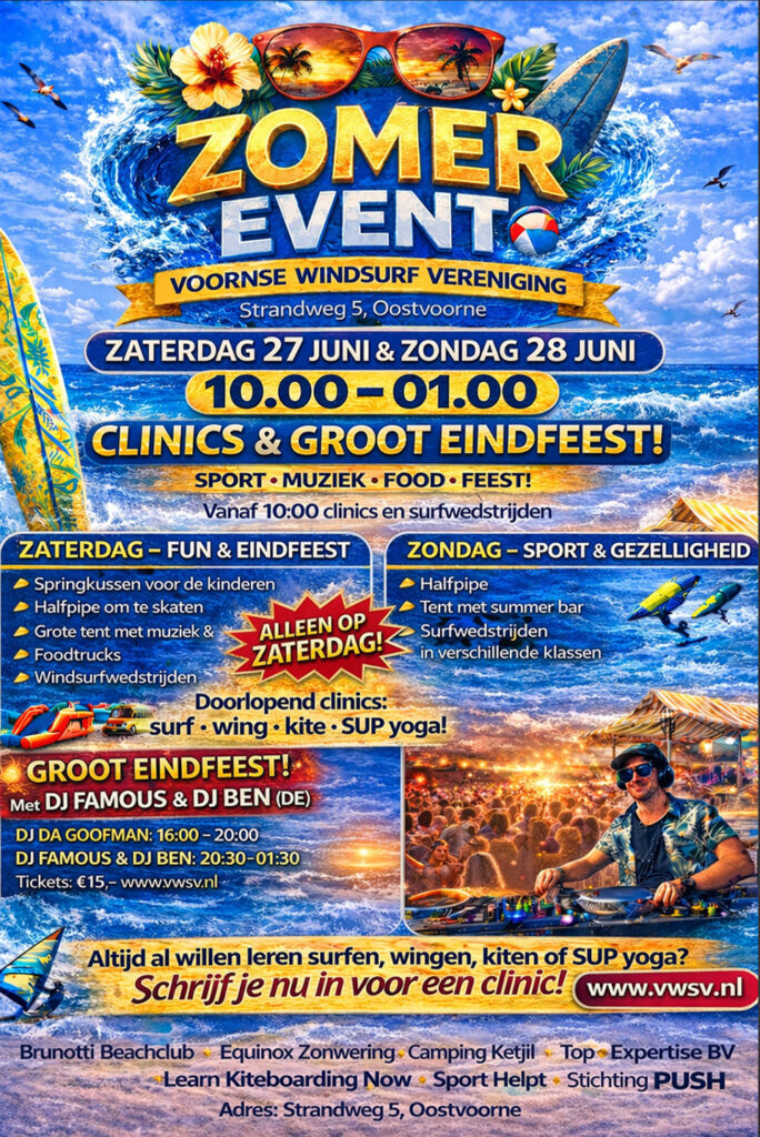 Tijdens het weekend kun je meedoen aan verschillende clinics, zoals surf, wing, kite en SUP yoga. Omdat het aantal plekken per clinic beperkt is, is vooraf boeken zeker aan te raden.